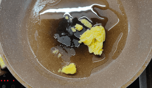 Put 1 tablespoon of melted butter and 1 tablespoon of vegetable oil in the pan.