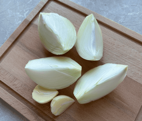 Cut the onion into four parts and the garlic clove in half.