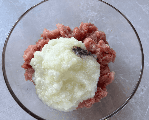 Add onion and garlic, salt, and pepper to the minced meat.