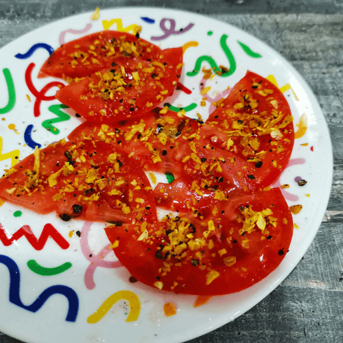 Cut the tomatoes into small slices, then salt, pepper, and season with dried onion.
