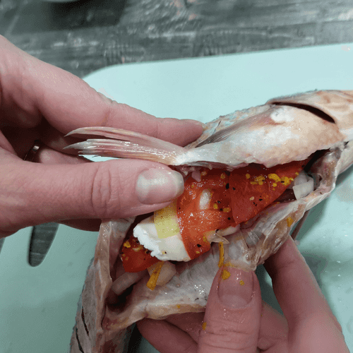 Stuff the fish with tomato, onion, and thin slices of brie cheese.