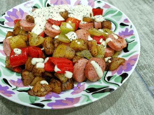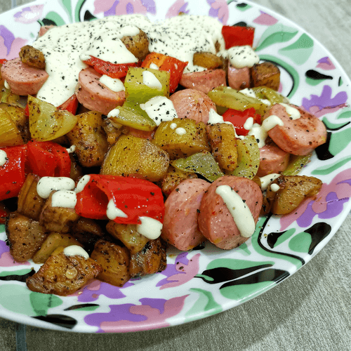 Sauté of eggplants and sausages is a fragrant and hearty dish of Russian cuisine that combines the tenderness of eggplants, the sweetness of peppers, and the spiciness of mustard. It resembles traditional village dishes where housewives used simple ingredients to create true culinary masterpieces. The sauté gains a rich flavor from frying vegetables in aromatic mustard oil, while garlic makes it even more appetizing. Sausages add juiciness and make the dish perfect for a family dinner. A light sauce made from sour cream, mayonnaise, and lemon juice adds harmony to the taste. This sauté can be served as a standalone dish or used as a side dish. It pairs wonderfully with bread, potatoes, or rice, creating warmth and comfort at home.