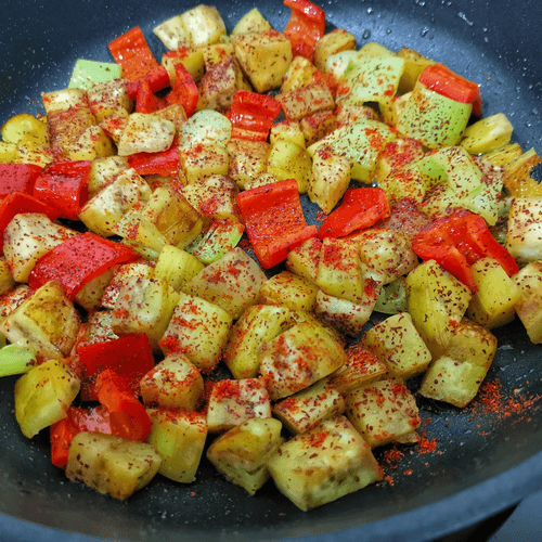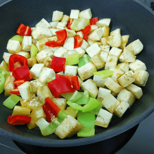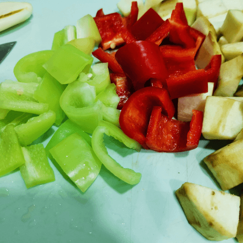 Cut the peppers and eggplant into small pieces.