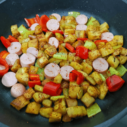 Stir the vegetables after 3-4 minutes, add the sausages. Fry for another 7 minutes over medium heat, stirring occasionally.