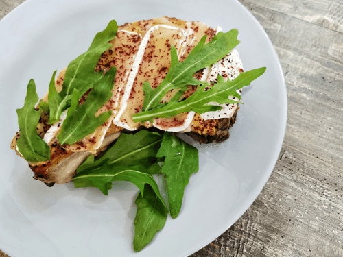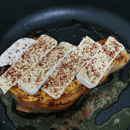 Pork loin with brie cheese is an exquisite dish of French cuisine that combines rich meat flavor with the delicate creamy texture of brie cheese. The loin, seared in aromatic mustard oil and brushed with Dijon mustard, acquires spicy notes that are beautifully complemented by the creaminess of melted cheese. A light tang from sumac adds a subtle Eastern touch, while fresh arugula completes the composition, giving the dish lightness and freshness. It’s an ideal choice for a romantic dinner or special occasion when one wants to enjoy true gastronomic harmony.