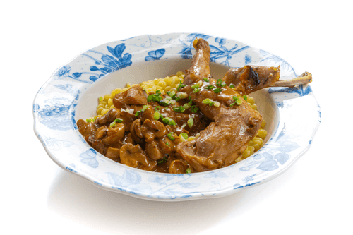 Serve the cooked rabbit with sauce and your favorite side dish — for example, ptitim, pasta, couscous, or mashed potatoes.