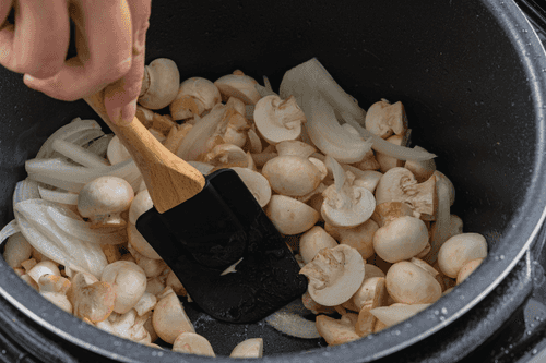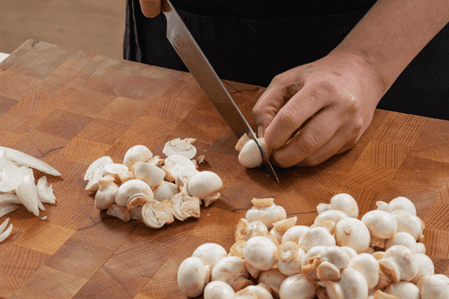 Slice the onion into feathers and the mushrooms into slices. If the mushrooms are small, you can just cut them in half.