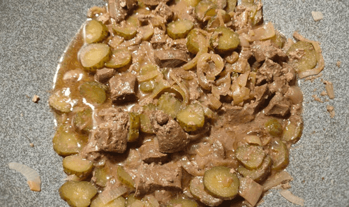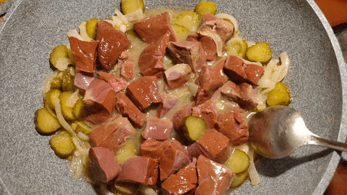 Говяжья печень тушенная с луком и маринованными огурцами — это сытное и ароматное блюдо русской кухни, сочетающее мягкость печени, сладость обжаренного лука и пикантность маринованных огурцов. Исторически печень всегда была доступным и питательным продуктом, используемым в народной кухне для создания насыщенных, согревающих блюд. В этом рецепте нежная печень сначала очищается, а затем тушится с луком, который карамелизируется до золотистого оттенка, добавляя глубину вкуса. Маринованные огурцы придают свежую кислотность, уравновешивающую богатый вкус печени. Блюдо идеально подходит к картофельному пюре или рассыпчатой гречке, создавая гармоничный и уютный ужин. Оно часто встречается на семейных столах благодаря простоте приготовления и неповторимому вкусовому балансу.
