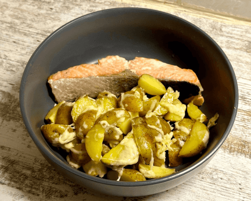 Запеченная семга с молодым картофелем — это истинное воплощение изысканности европейской кухни. Нежное, сочное филе семги, пропитанное ароматом оливкового масла и специй, гармонично сочетается с мягкостью молодого картофеля, запеченного до золотистой корочки. Завершающий штрих — расплавленный сыр, который добавляет блюду насыщенности и легкой пикантности. Простота приготовления делает его идеальным выбором как для семейного ужина, так и для праздничного застолья. Блюдо универсально — его можно подать с свежими овощами, зеленью или легким соусом на основе лимона. Истоки рецепта уходят в традиции средиземноморской кухни, где ценятся свежие, натуральные продукты и минимальная термическая обработка для сохранения вкуса. Это угощение принесет наслаждение гурманам, ценящим качество и естественные вкусовые оттенки.