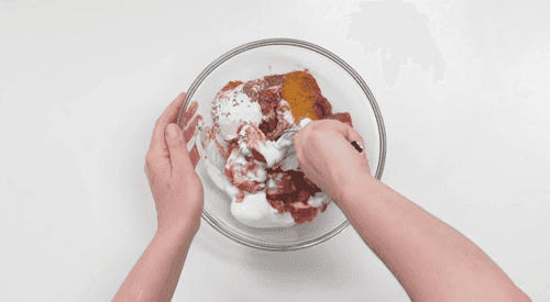 Mix half of the yogurt with garam masala, turmeric, ground coriander, paprika, cumin, ground chili, and salt.