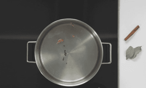 Bring 2-3 liters of water to a boil, add cloves, bay leaf, star anise, cardamom pods, cinnamon stick and bring to a boil again. Add salt.