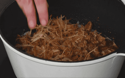 Return all the fried meat to the pot and add the fried onion.