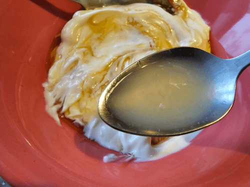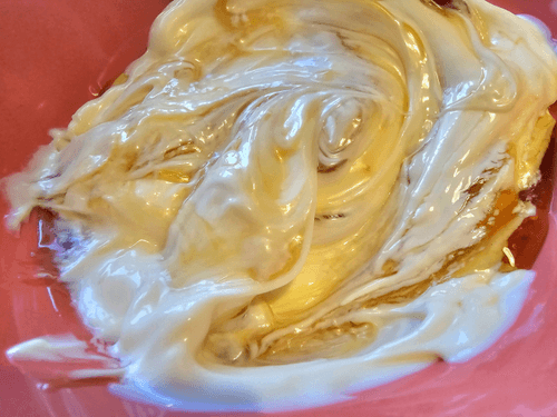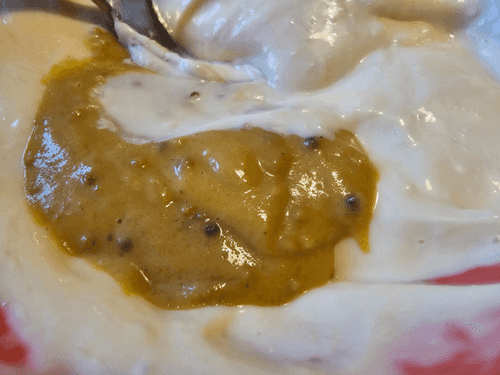 Add two types of mustard to the sauce. Mix the sauce until smooth. Add the sauce to the other ingredients and mix.