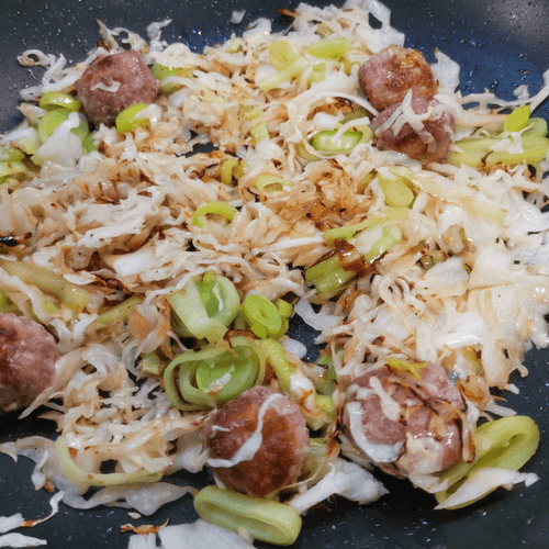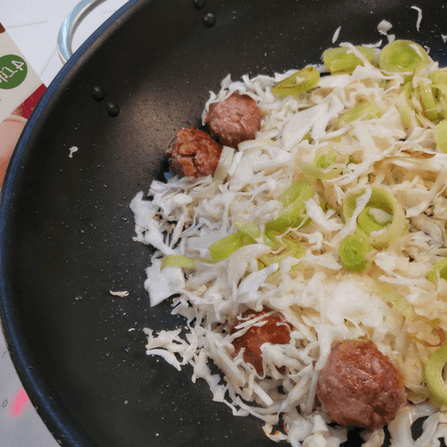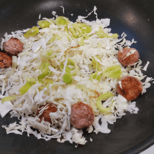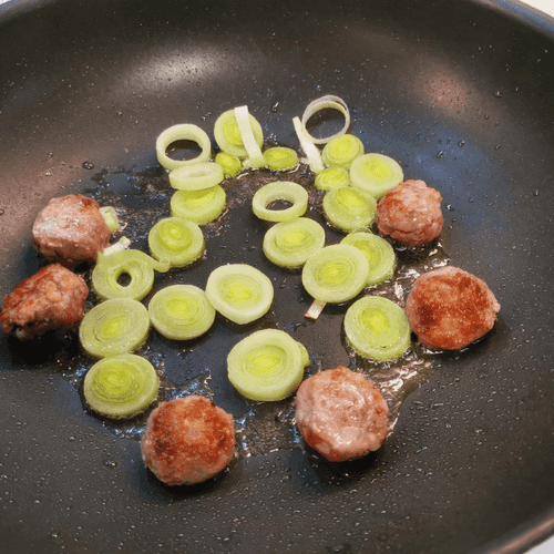 After 2-3 minutes, flip the meatballs and add leeks.