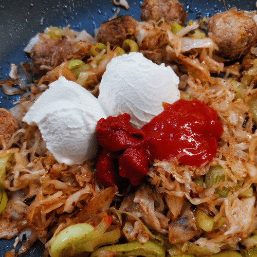 After 5 minutes, add sour cream, tomato paste, and chili sauce.
