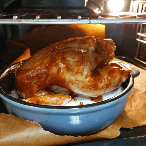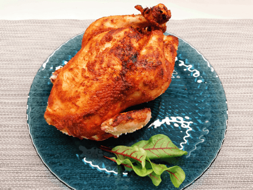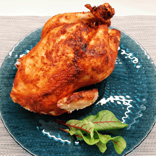 Send to a preheated oven at 180 degrees for 20-25 minutes (depending on the size of the chicken).
