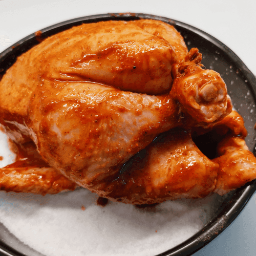 Place the chicken, coated with the sauce on all sides, on top of the salt.
