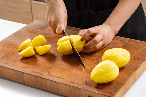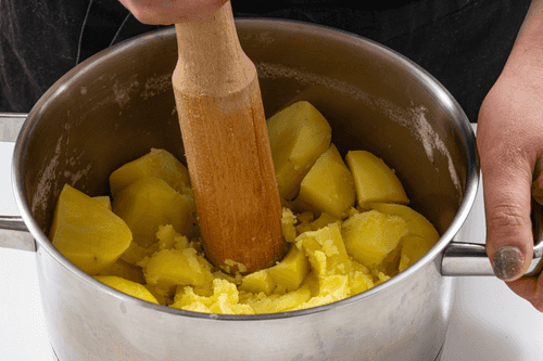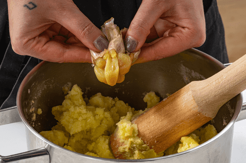 Mash the potatoes and squeeze in the garlic cloves, then mix. Add salt and pepper to taste.