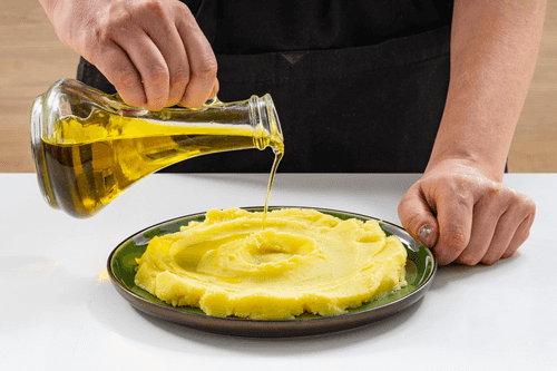 Drizzle the puree with good first-press olive oil to complement the sweetness of the garlic with the herbaceous flavor of olives. Garnish with finely chopped parsley.