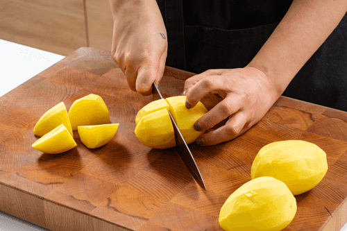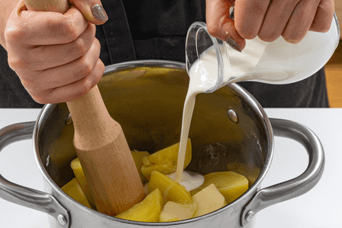Mash the cooked potatoes into puree, adding butter and cream, and season with salt.
