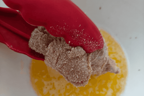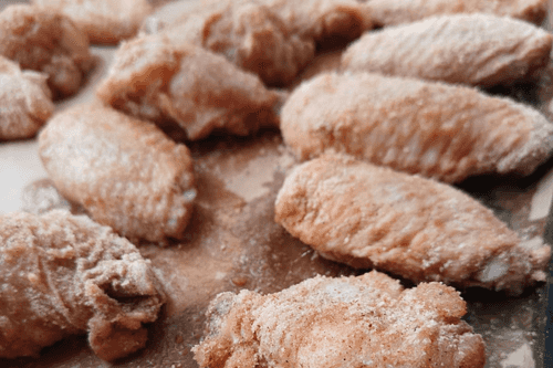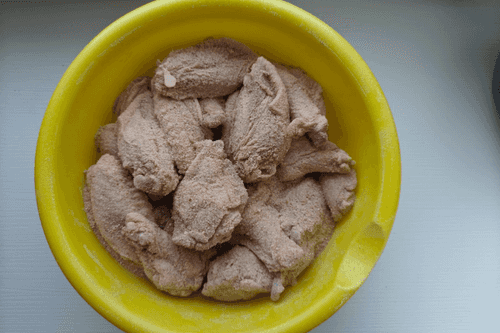 Place the chicken wings in a deep bowl, add the breading mixture, and mix to coat the meat completely.