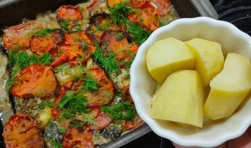 When the dish is ready, tear the dill by hand and place it on top. The fish can be served with boiled potatoes or as a standalone dish.