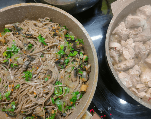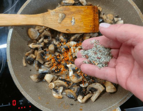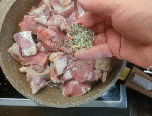 Place in the pan, add spicy salt, and fry for about 10 minutes while the noodles and mushrooms with onions cook.