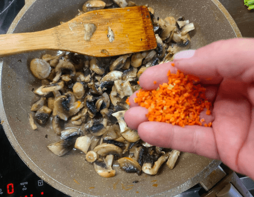Add dried carrots to the onion-mushroom mixture.