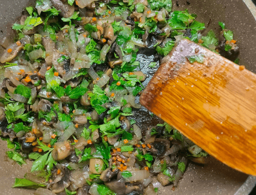 Add greens to the prepared onion-mushroom mixture and stir.