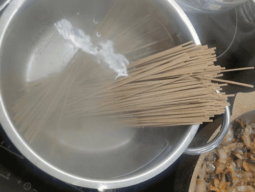Buckwheat noodles (soba) with mushrooms, onions and turkey