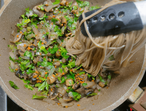 Transfer the cooked noodles to the mushroom mixture.