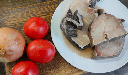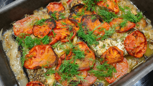 Wolffish with tomatoes and onions