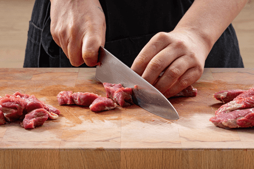 Clean the beef from membranes and cut it into cubes.