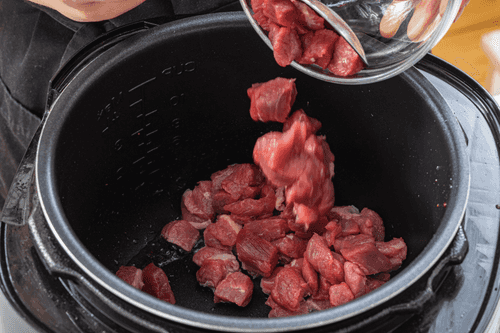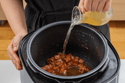Add tomato paste to the beef and continue frying for a few more minutes. Then pour broth over the meat.