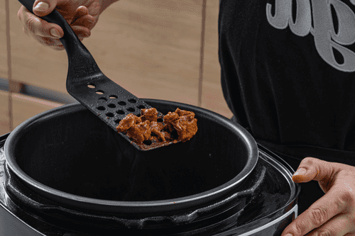 Cover the multicooker and cook on the 'Stew' mode until it falls apart into fibers. Add salt and pepper.