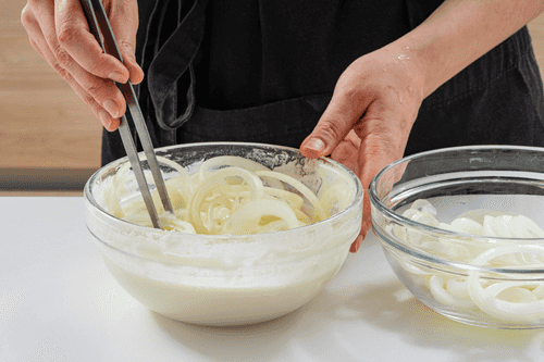 Slice the onion into rings and separate them. Dip the rings in batter.