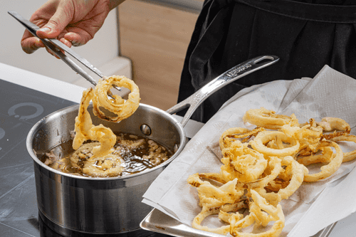 Heat the frying oil well and fry the onion rings in portions. When the rings turn golden, remove them from the oil and drain on paper towels.