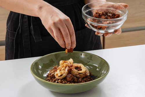 Place lentils with meat, onion rings, and bacon chips in each plate.