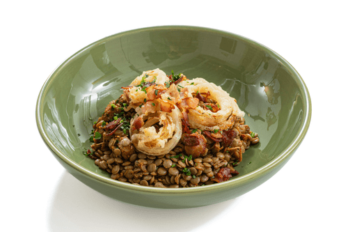 Lentils with stewed meat and onion rings
