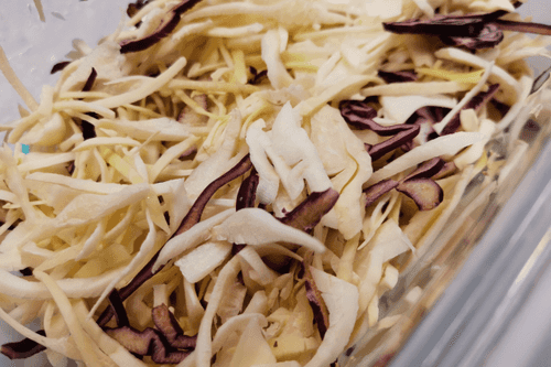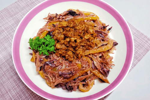 Place the vegetables in a deep dish. Put the fried minced meat in the center and serve.