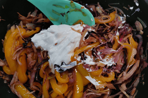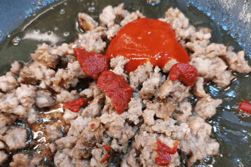 Add tomato paste and chili sauce to the minced meat. Mix thoroughly. Fry for another 3 minutes, then remove from heat and cover with a lid.
