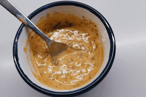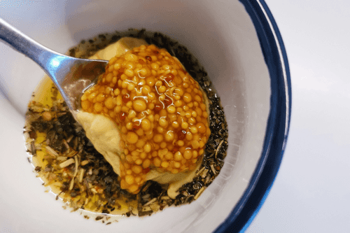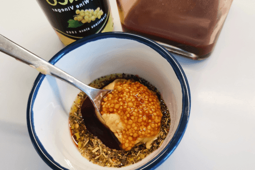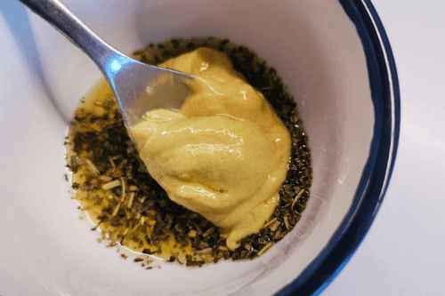 For the sauce, pour extra virgin oil into a deep container. Add herbs to the oil.