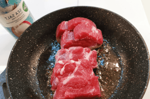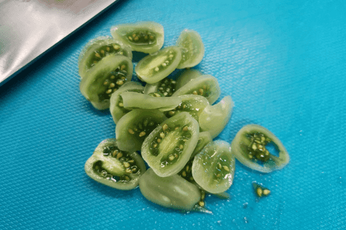 After 5 minutes, place the sliced cherry tomatoes on the meat.