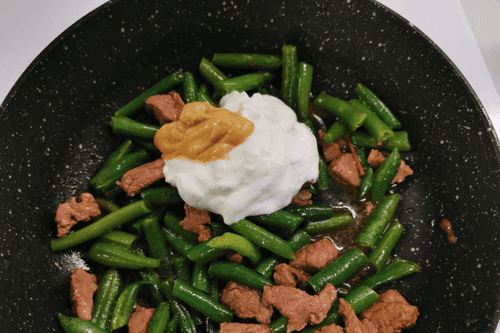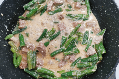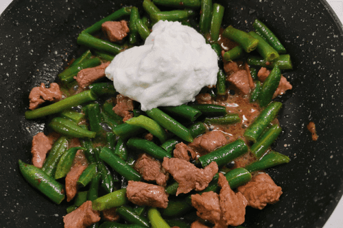 Add cottage cheese to the beans with pork.