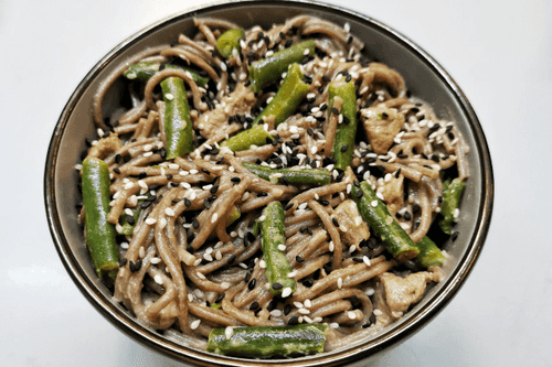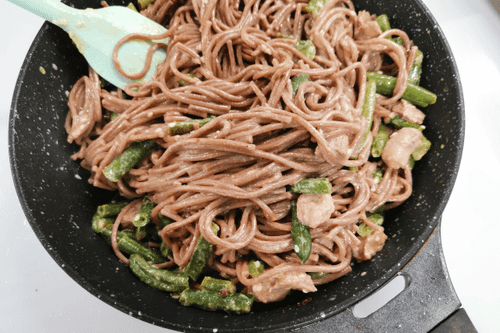 Buckwheat noodles with green beans and pork