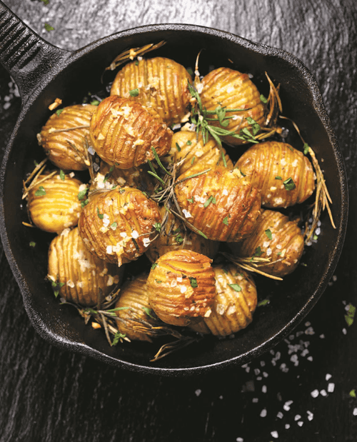 Place the potatoes in a baking dish or cast iron skillet (make sure the handle is also cast iron and can be placed in the oven).