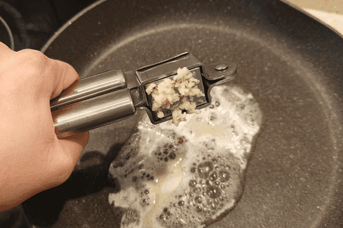 Melt the butter in a heated pan and press the garlic through a press. Fry until golden.