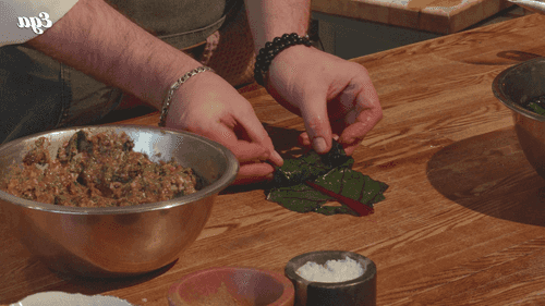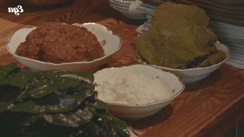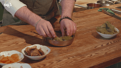 Soak grape leaves in water (if dry) or rinse off excess salt (if pickled). Lay two layers of grape leaves at the bottom of the baking dish so that they stick out halfway from the dish.