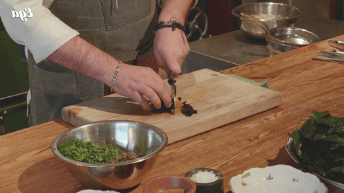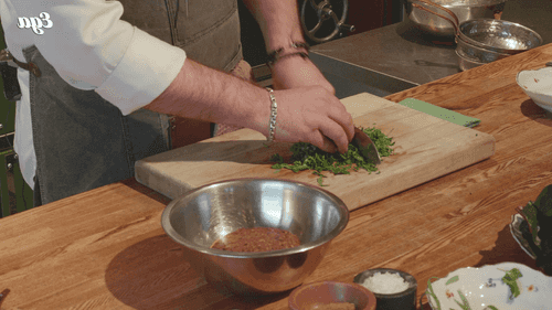 Remove the tough stems from all the greens (parsley, cilantro, tarragon), chop them with a knife, and add to the minced meat.
