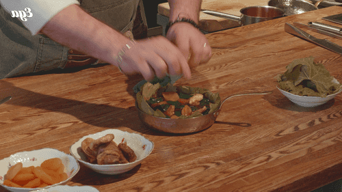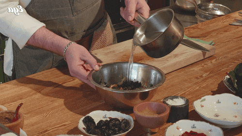 Tear the remaining prunes and dried apricots (if used) by hand and place them in the gaps between the dolma. Lay cinnamon sticks on top of the dolma.